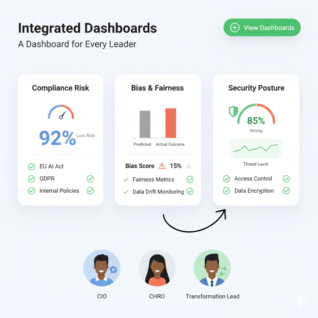 Our KPI dashboards give you a board-ready view of your AI risk across compliance, bias, and security. It helps CIOs, CHROs, and transformation leads make informed decisions based on real-time data.