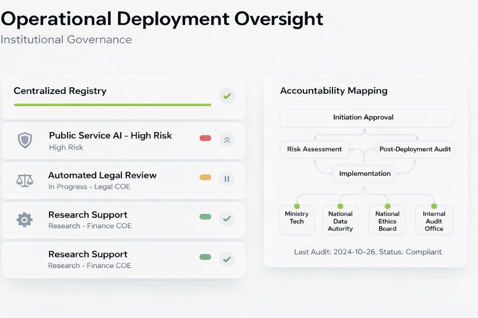 A2V establishes a centralized registry for all institutional AI deployments. This mechanism ensures that every rollout is documented, categorized by risk, and mapped to specific accountability structures. It provides the evidentiary basis required for transparency and long-term regulatory alignment.