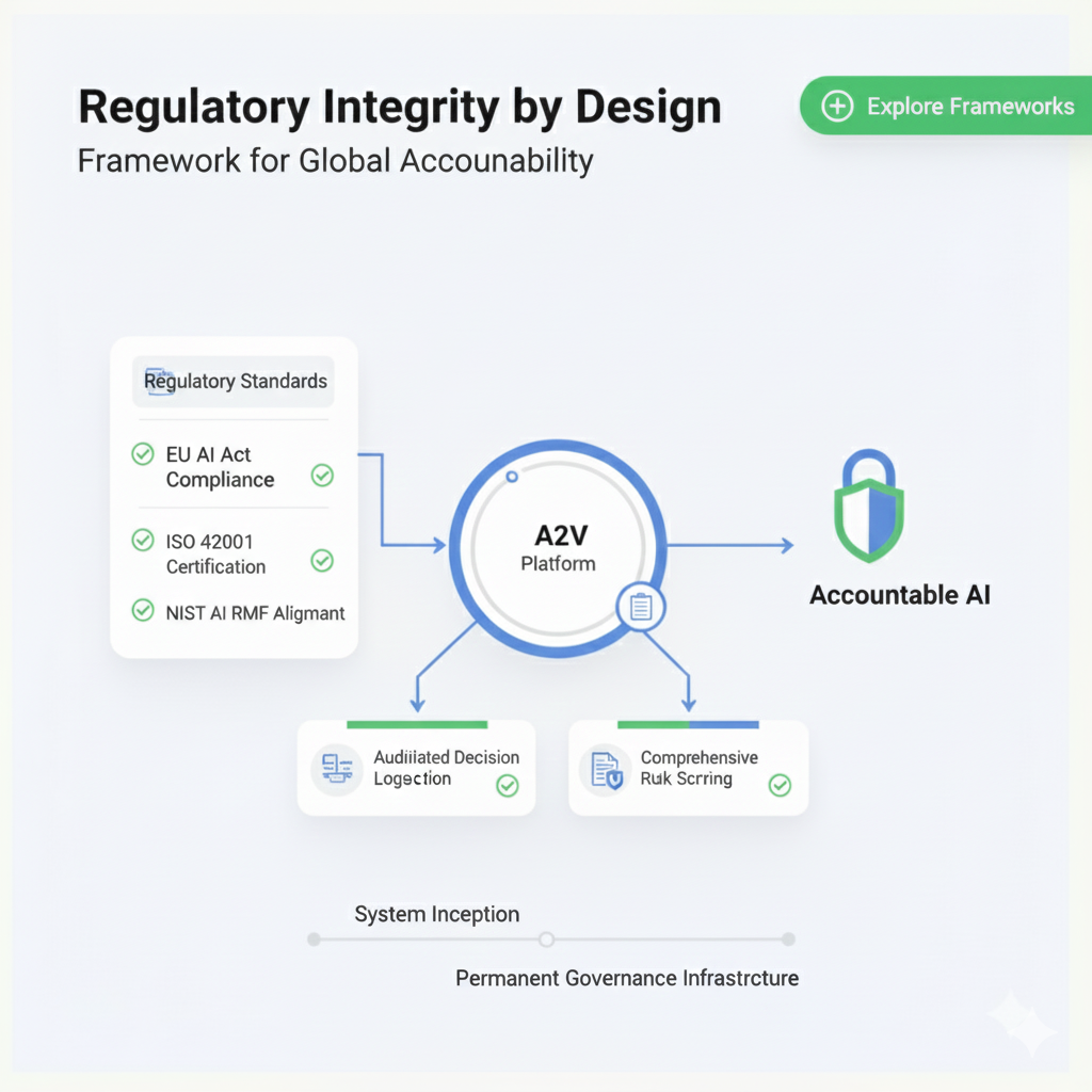 A2V’s architecture operationalizes the EU AI Act, ISO 42001, and NIST standards within institutional workflows. By embedding auditable decision logs and risk scoring into the system’s core, we ensure that governance is an active, permanent infrastructure rather than a reactive compliance checkbox.